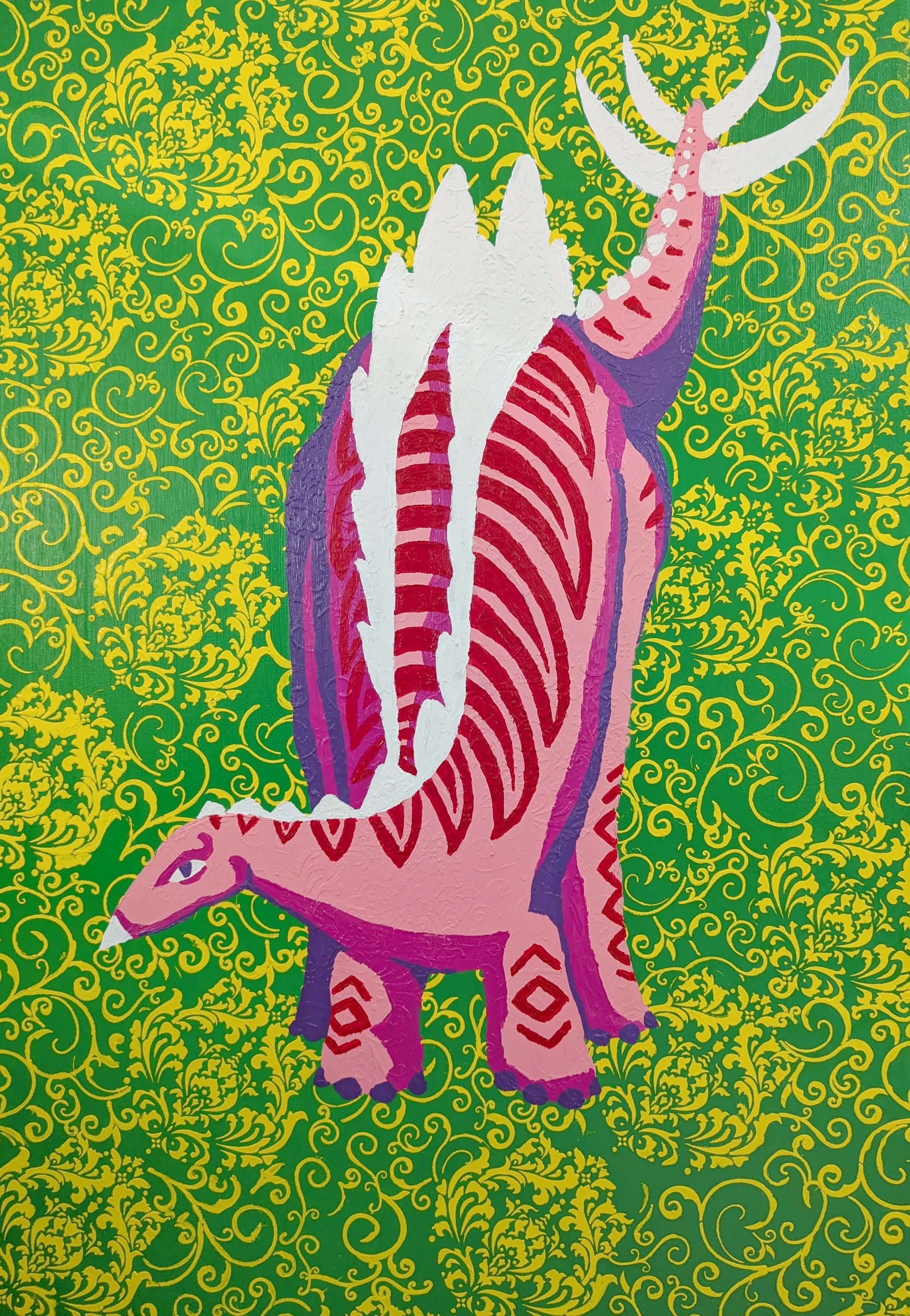 A stegosaurus rendered flat and frontal against a baroque damask field - acid green ground, thick stencil-painted yellow that allows the pattern’s texture to push through even into the open pink of the figure itself. The ornament doesn’t recede, it asserts.